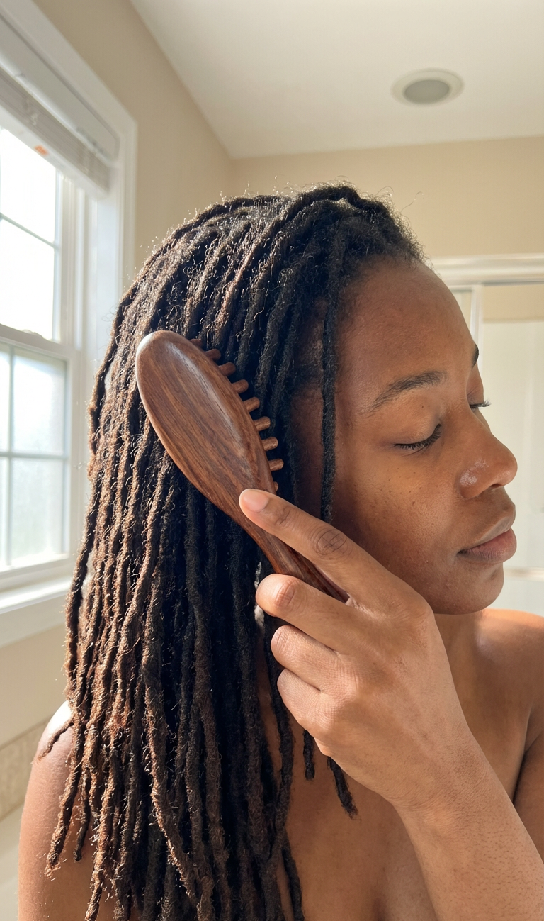 Brushing your locs daily help encourage overall root hair growth, straightening wild locs & mitigating dandruff and lint build up.